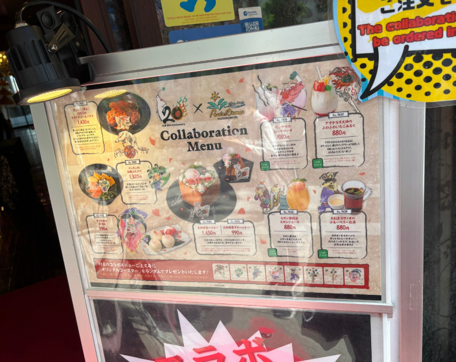 アマテラスをイメージした幻想的なドリンク、イッスンの和風どんぶりなど、世界観を再現したコラボメニューが登場。注文ごとにオリジナルコースターがもらえます(数量限定・なくなり次第終了)。